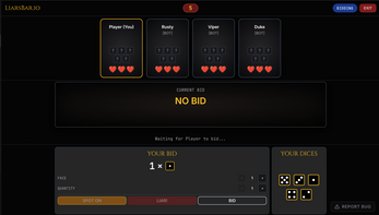 LiarsBar.io is a free multiplayer browser game based on the classic dice game of bluffing and probability (also known as Perudo, Dudo, or Liar's Dice). Play against friends online or challenge AI bots in a tense, grim-noir atmosphere.